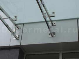 ОбъектыТЦ Рублево-успенском шоссе, "1-й километр" Козырек: материал - нержавеющая сталь зеркальная (полированная), покрытие - стекло матовое тонированное.
